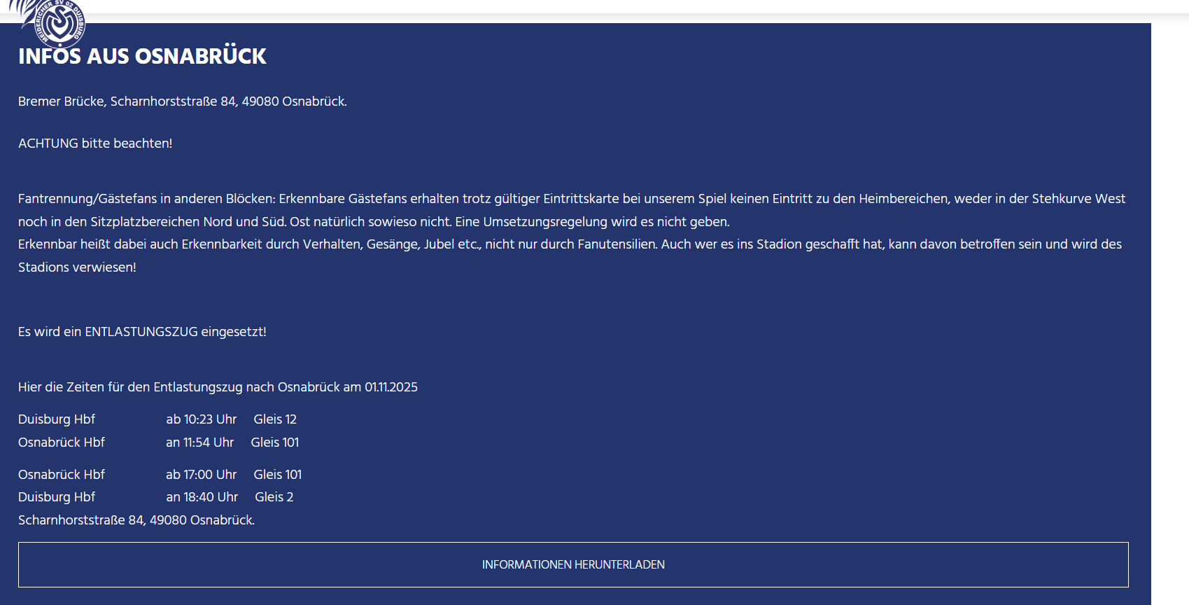 Zumindest in der Saison 14/15 wäre ich damit ziemlich sicher nicht reingekommen. Das Gastspiel an der Bremer Brücke war im tiefsten Winter, gefrorener/ halb eingeschneiter Platz, und ich musste seinerzeit tatsächlich Jacke und den Zip-Pullover darunter öffnen, damit der Ordner sicherstellen konnte, dass ich auch kein MSV-Shirt trug.