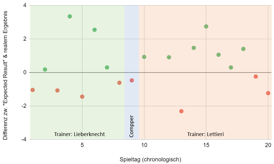 Unser Wert liegt ja im Schnitt bei 1,27, was auf zwanzig Spiele 25,4 Tore bedeuten würde. Real haben wir 23 Tore, so dass wir etwas unterperformt haben, also im Abschluss weniger glücklich oder weniger effektiv als die Vorhersagen (oder das was wir uns erspielt haben) waren.